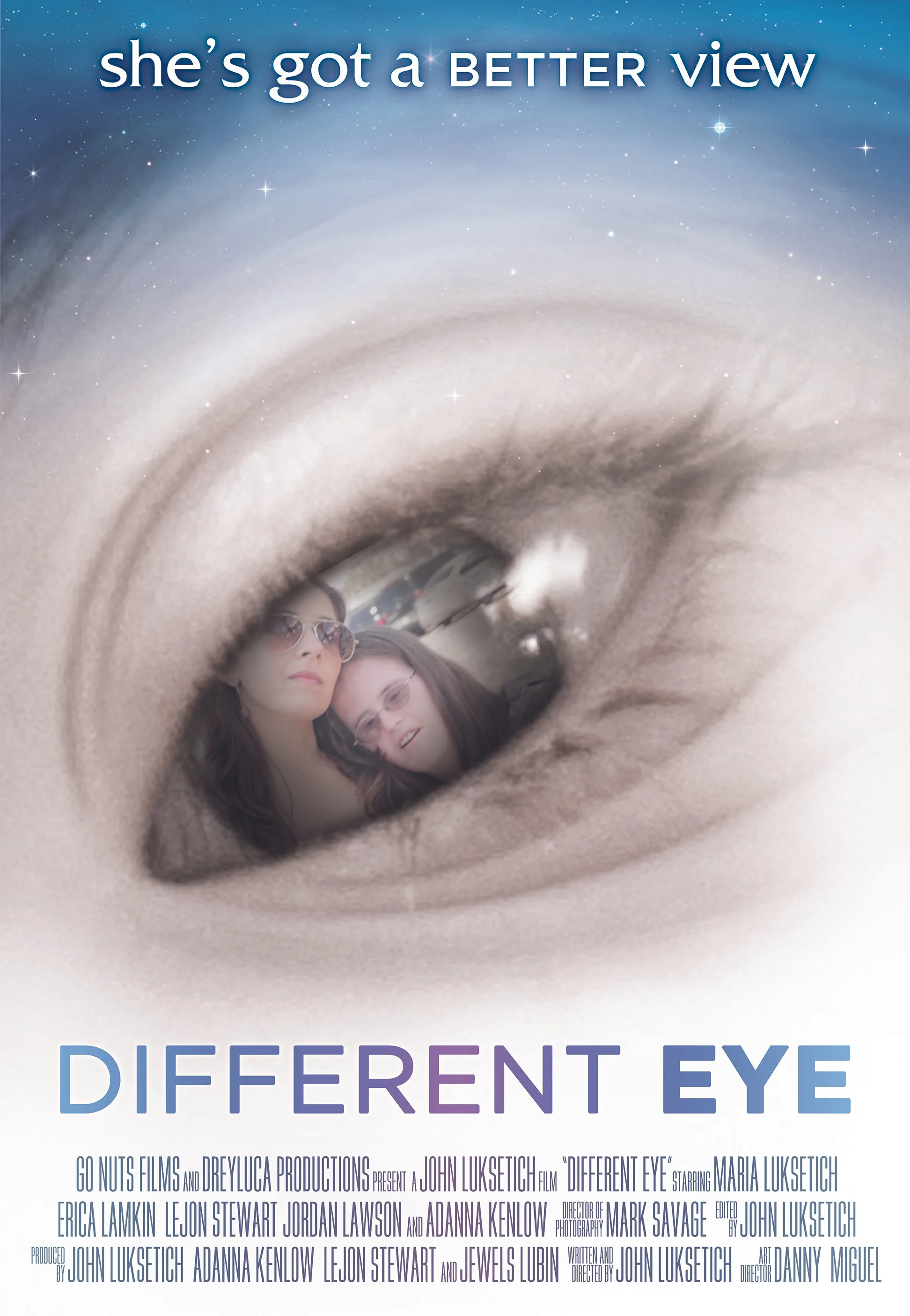 Different Eye is dedicated to my daughter Maria who God gave us in our life. She was born not only with Down syndrome yet also with a hole in her heart. That hole has healed and Maria has gone on to heal many other people’s heart who have had the opportunity to meet her including all the cast in Different Eye. Though Maria has a stuttering problem that didn’t hold her back from giving her all in Different Eye showing real emotion in every scene. sometimes spending up to 12 hours on the set. All her skills were shown in her film such as rock climbing, bike riding, bowling, mini-golf, go-cart racing, dancing, karaoke and of course beating everyone at Uno. All locations and actors donated their places and time to make this special movie.